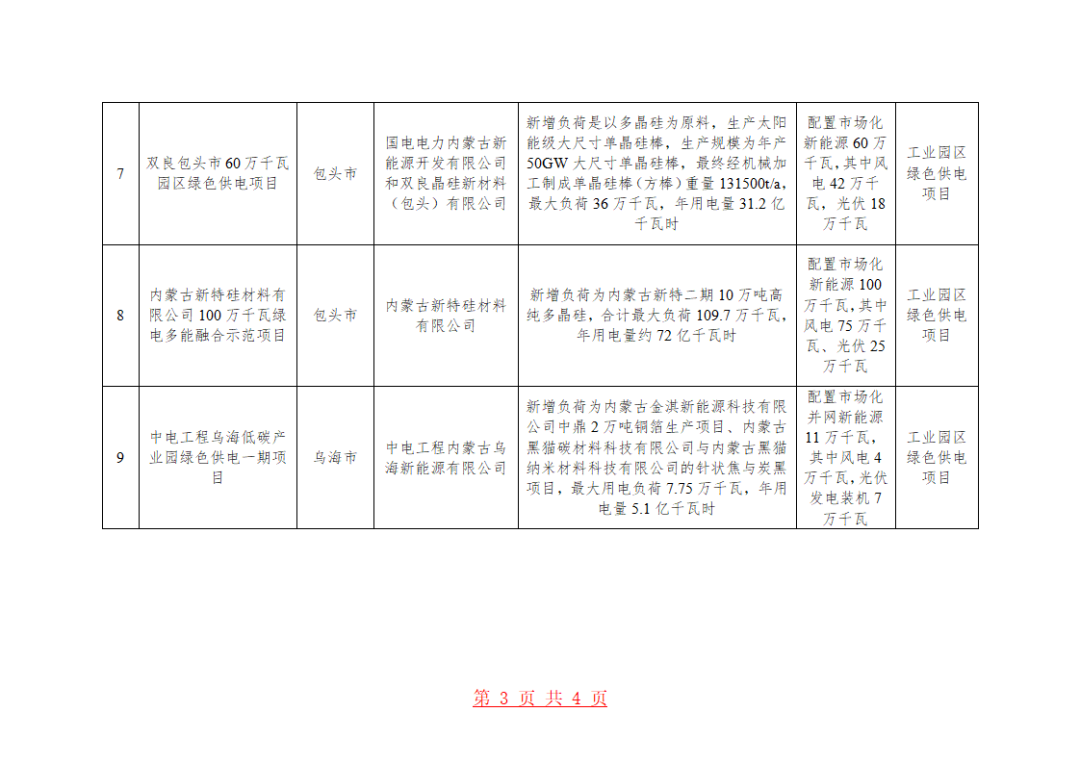 (八)內(nèi)蒙古新特硅材料有限公司100萬(wàn)千瓦綠電多能融合示范項(xiàng)目。新增負(fù)荷為內(nèi)蒙古新特二期10萬(wàn)噸高純多晶硅,合計(jì)最大負(fù)荷109.7萬(wàn)千瓦,年用電量約72億千瓦時(shí),配置市場(chǎng)化新能源100萬(wàn)千瓦,其中風(fēng)電75萬(wàn)千瓦、光伏25萬(wàn)千瓦,配建電化學(xué)儲(chǔ)能20萬(wàn)千瓦/4小時(shí)。