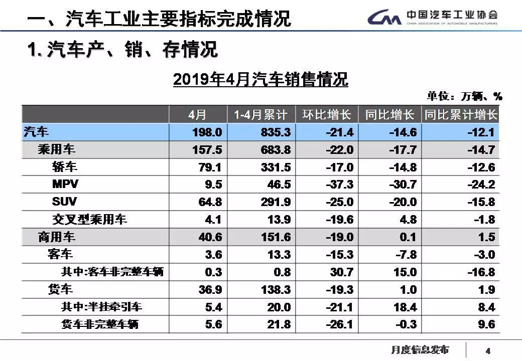 1、汽車整體:4月銷量198萬輛,下降14.6%;1-4月銷量835.3萬輛,下降12.1%;