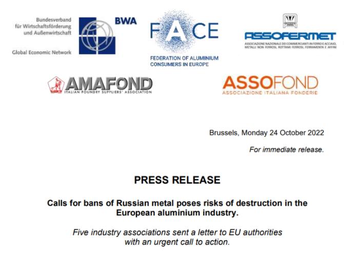 當?shù)貢r間周一(10月24日),五家歐洲行業(yè)協(xié)會發(fā)表聯(lián)合聲明,鄭重呼吁歐盟阻止對俄羅斯的鋁禁運、制裁、征收高額關(guān)稅等潛在的措施。