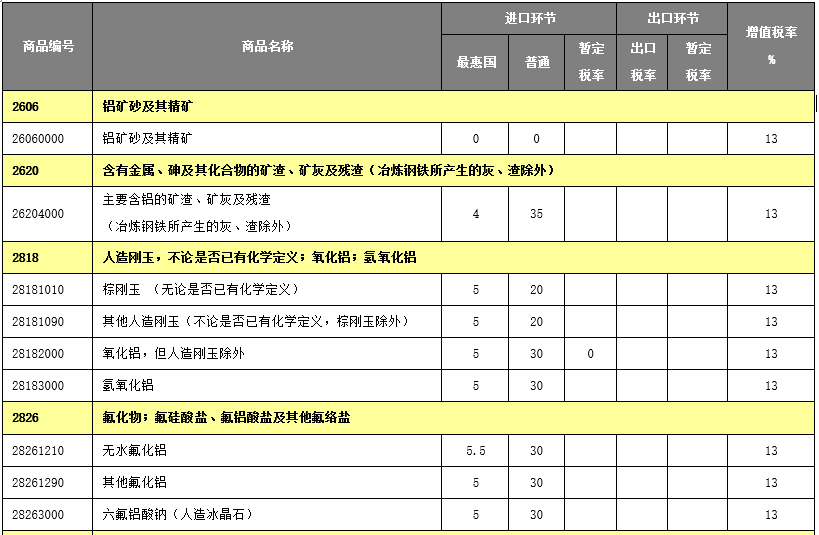 《中華人民共和國進出口稅則》(2021年版)鋁相關商品關稅見下表。