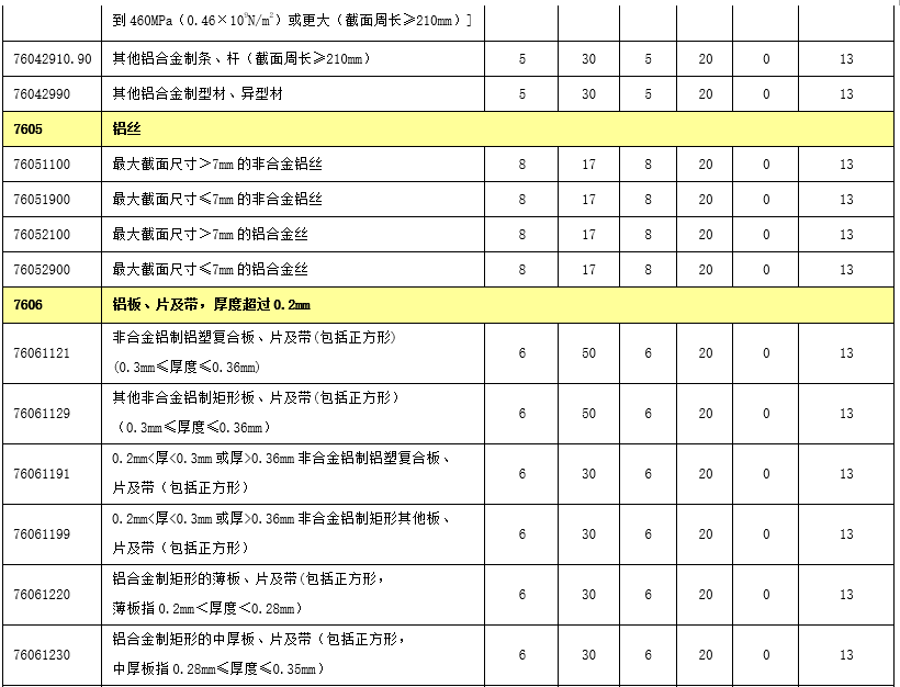 (1)稅則號為76061129的“其他0.3mm≤厚度<0.36mm的非合金鋁制矩形鋁板片帶”,進口暫定關稅由2020年的4%上升至6%;